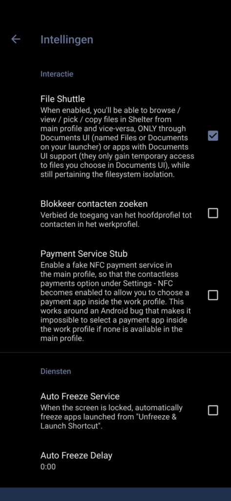 Shelter zorgt ervoor dat je naast je gebruikelijke profiel (waar je meteen in terechtkomt bij het opstarten van je apparaat) en Private Space ook een Werkprofiel hebt. Het werkprofiel is een aparte omgeving waar je snel naartoe kunt schakelen. Dit biedt als voordeel dat je bijvoorbeeld Big Tech-apps die je veel gebruikt (zoals mogelijk WhatsApp of Telegram) gemakkelijk kunt isoleren. Op deze manier hebben de apps geen toegang tot je foto’s, bestanden en contacten in je persoonlijke profiel. Daarnaast kun je het Werkprofiel volledig uitschakelen wanneer je dit niet gebruikt. De apps in het Werkprofiel worden dan volledig uitgeschakeld en kunnen niks meer doen op de achtergrond.