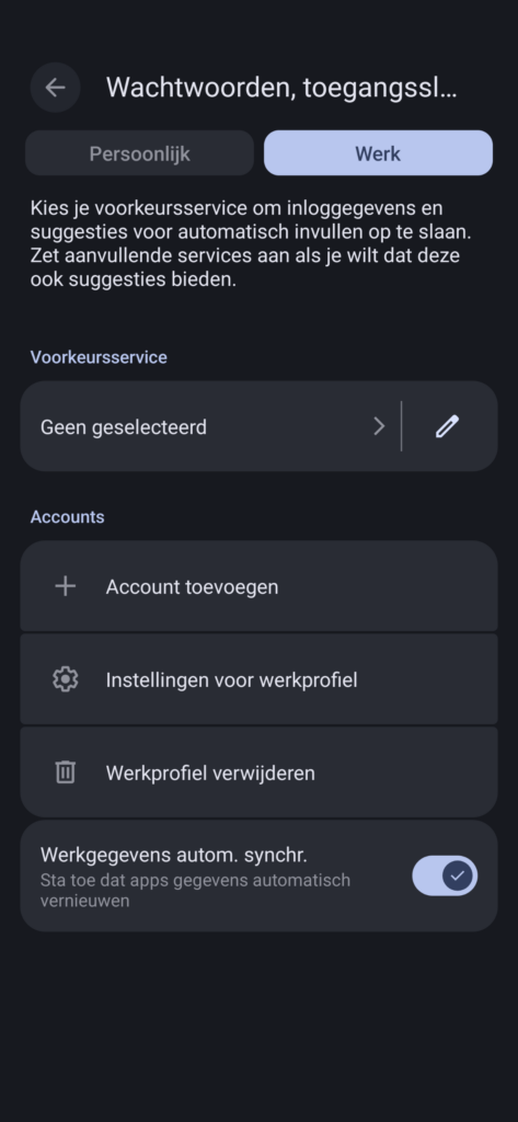 | Werk-apps pauzeren | Deze optie is alleen zichtbaar in het Werkprofiel en geeft je de mogelijkheid om (alle) apps die in het Werkprofiel staan te pauzeren (bevriezen) waardoor ze niet meer actief zijn totdat je op de knop Hervatten tikt. |