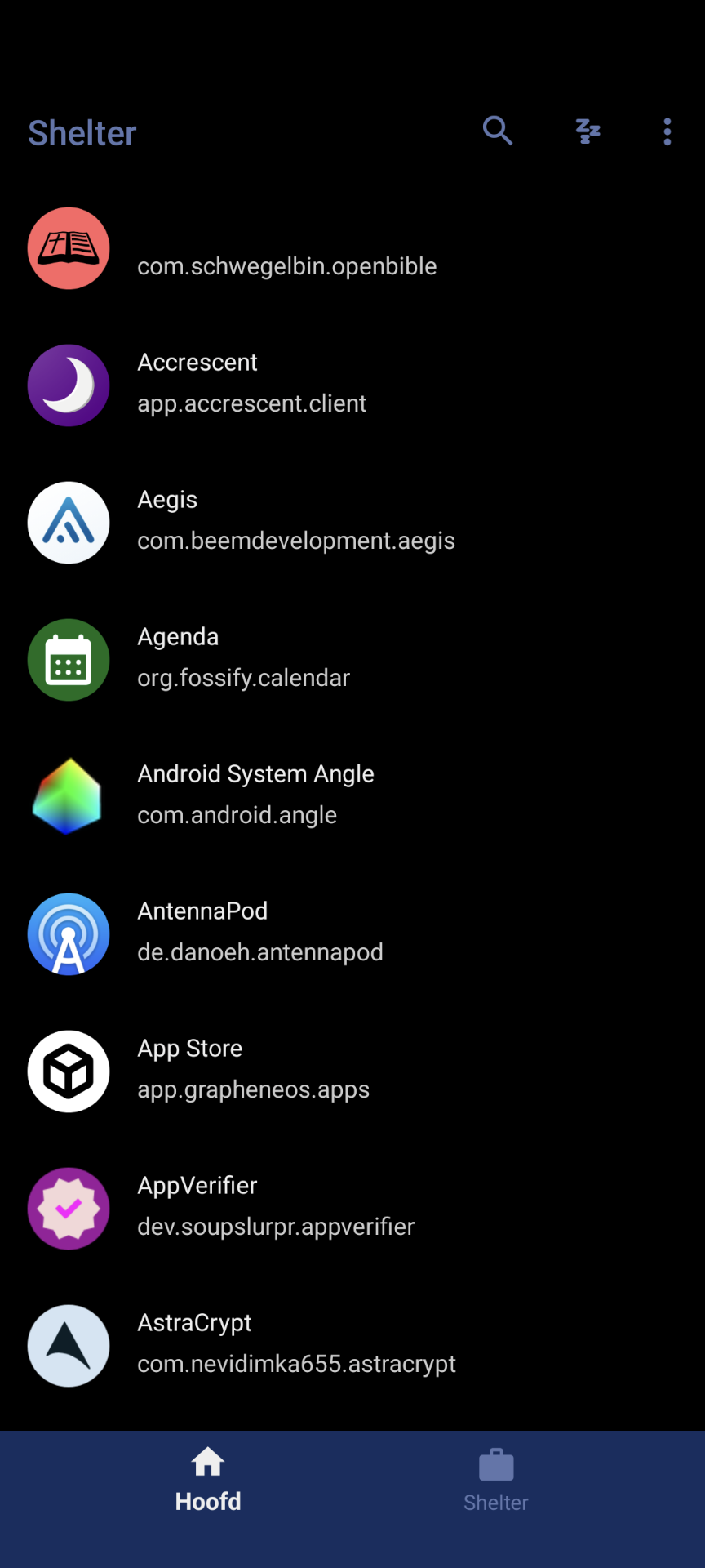- Je krijgt nu een aantal apps te zien, waaronder Accrescent, F-Droid en Aurora Store. Daarnaast vind je hier de App Store van GrapheneOS, een bestandenapp en een app voor je contacten. Deze app wordt door Shelter standaard overgezet. Alle apps die in het werkprofiel staan, hebben in tegenstelling tot apps die in het hoofdgedeelte staan een blauw koffertje. Dit is een indicator, waardoor je kunt zien waar de apps van afkomstig zijn.