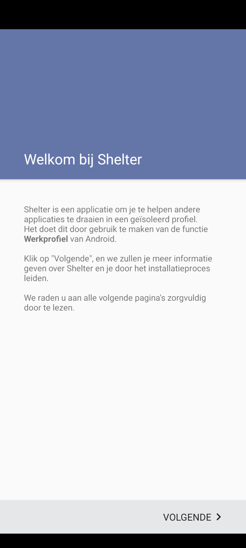 Shelter is een app waarmee je een zogenaamd werkprofiel kunt aanmaken dat onder het primaire gedeelte van het apparaat valt. Dit primaire gedeelte wordt na de installatie van Shelter hernoemd naar Prive. Gebruikers die voor augustus 2025 een telefoon en/of tablet hebben ontvangen, zijn bekend met dit concept via de app Island. In tegenstelling tot Island geeft Shelter je wat meer mogelijkheden rondom het kunnen stopzetten (bevriezen) en isoleren van apps. Mocht je Island gebruiken en na het lezen van deze introductietekst over willen gaan naar Shelter, kijk dan op het tabblad Installatie voor een instructie.
